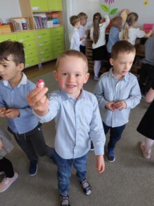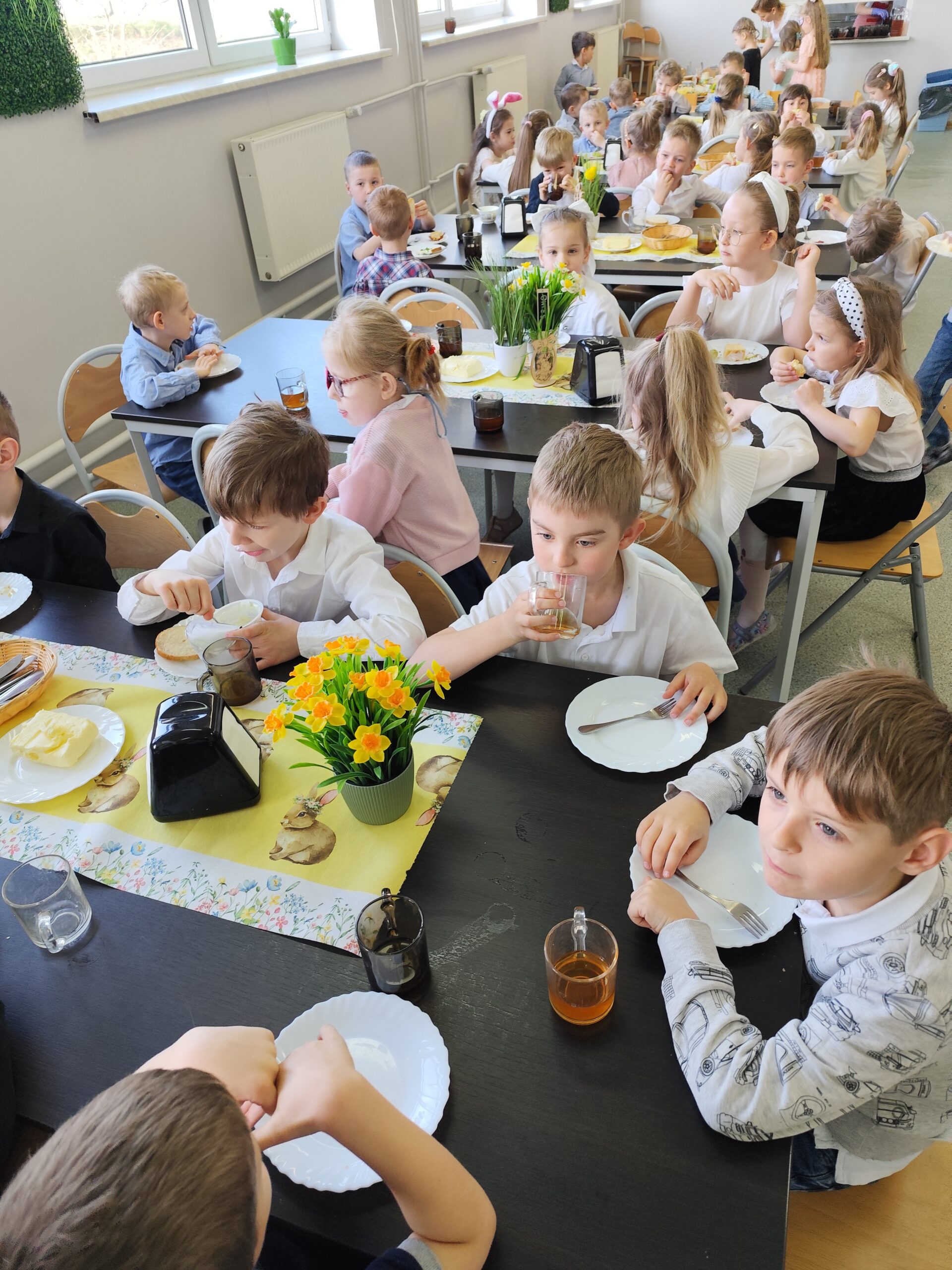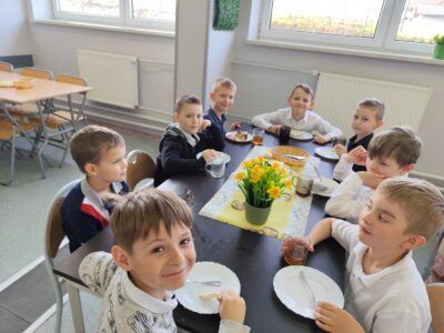 1 kwietnia w naszym przedszkolu odbyło się uroczyste śniadanie wielkanocne. Dzieci zasiadły do pięknie udekorowanego stołu, na którym znalazły się tradycyjne wielkanocne potrawy. Po wspólnym posiłku wszystkie grupy miały okazję obejrzeć świąteczne przedstawienie. Na zakończenie odbyło się radosne poszukiwanie czekoladowych jajek. Spotkanie przy wspólnym, świątecznym stole dostarczyło dzieciom wielu uśmiechów i niezapomnianych chwil.